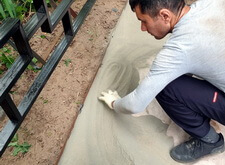 Для того, чтобы предотвратить произрастание травы в швах между плитками, мы уложили на территории участка геотекстиль, который затем засыпали пескобетонной смесью.